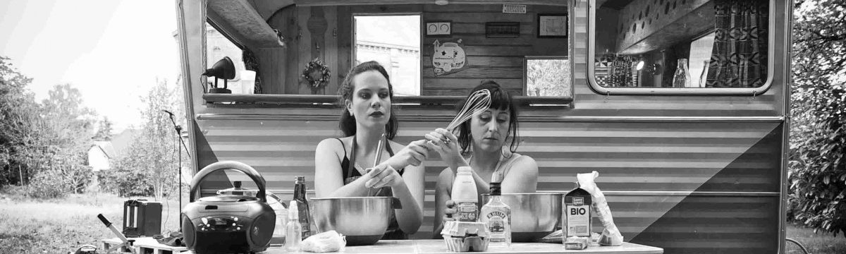 Une caravane. La porte s’ouvre sur Suzette, elle est dans un matin difficile, une vague gueule de bois où les gestes et les pensées ne trouvent plus leur forme. Puis Nora apparaît, brillante de mille paillettes. Elle se maquille, se re-maquille, essaye des vêtements puis les jette, ajoute au désordre ambiant. Au premier coup d’œil, on sait qu’elles sont ensemble depuis longtemps. On ne sait pas bien si ce sont les client·es qui sont en avance ou elles qui sont en retard mais que rien n’est prêt…
